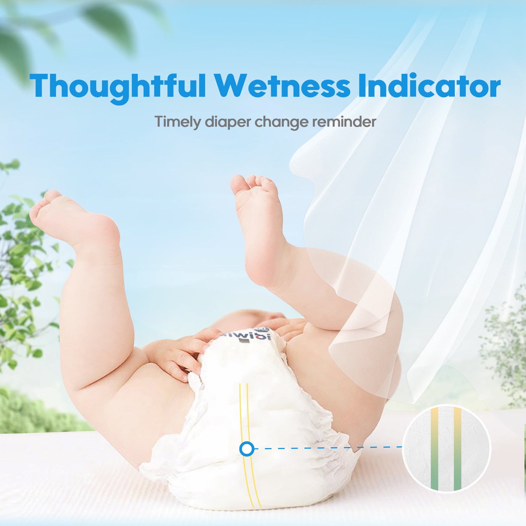 • Convenient wetness indicator signals when it’s time for a change, making diaper care easy, stress-free, and worry-free for parents.